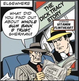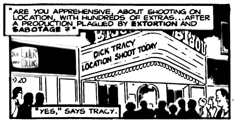 An incident early in the "Dick Tracy Story" continuity (in which the unnamed actor playing Tracy becomes frustrated with the latex appliques that are altering his facial features) was apparently inspired by Warren Beatty's refusal to use elaborate make-up in the 1990 feature film to make himself more closely resemble the character's appearance in the strip.