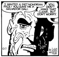 Dab Stract returned to Dick Tracy's city and sought out the cosmetic surgeon Dr. Beau Tox. Tox operated on Stract's face, altering it in a way inspired by the artist Salvador Dali. Stract - confident that his new face would prevent him from being recognized and identified - then attempted to sell a forged painting. His buyer was an undercover FBI agent who tried to arrest Stract. Stract assaulted the officer and fled, leaving the forgery behind. Stract's fingerprints on the forgery were then used to establish his identity and posters were an artist's rendering of his new face (based on the FBI agent's description) were circulated.