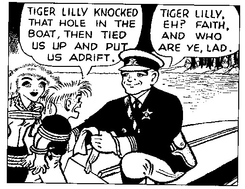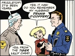 Dennis' patrol car happened to be passing the river where Tiger Lilly had set Frizzletop and Junior adrift in a leaking canoe. He rescued the pair and took them back to the Tiger Rest. There, he helped in the rescue of Dick Tracy and the investor Mr. Chance from a second death-trap that Tiger Lilly had arranged.