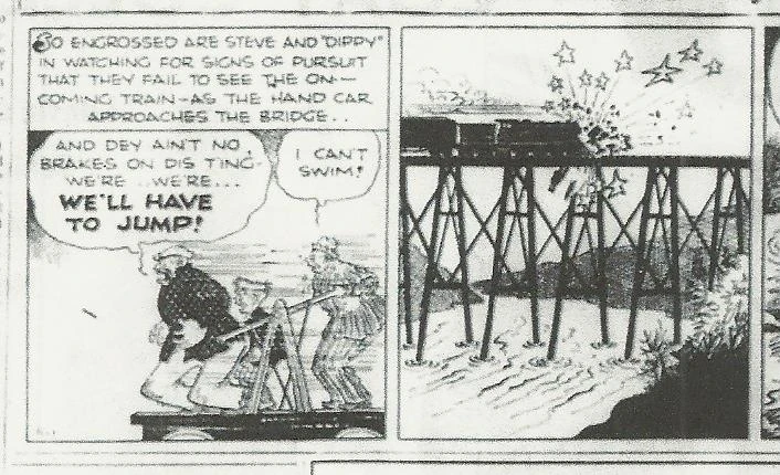 Steve the Tramp had kidnapped Junior Tracy and taken him across the country to Hank Steele. During the course of their journey they came across an old associate of Steve's called "Dippy" McDoogun. Steve and Dippy stole a handcar from two railroad workers at gunpoint.