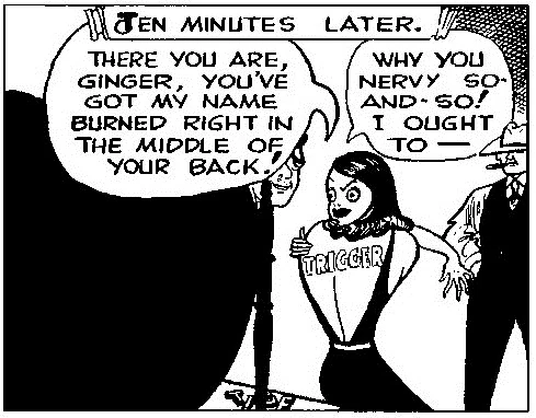 An attractive young woman (as well as a thrill-seeker), it was quickly revealed that Ginger was the girlfriend of Jimmy “Trigger” Doom, an underworld figure. She occasionally informed him of her father's plans, enabling him to avoid capture. Trigger “branded” Ginger using some printers’ letters and a sun lamp to burn his name into her back.