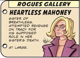 The original Heartless Mahoney story continues the trend of associating Breathless' depiction in the 1990 Dick Tracy feature film with her appearance in the comic strip. Heartless holds a newspaper that identifies Breathless as a singer (which she was never identified as in the original story), and it was implied that some romantic attraction existed between Tracy and Breathless (which was not indicated in the original story).