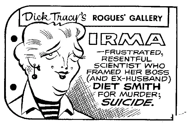 The plot was discovered due to the involvement of B.O. Plenty and Dick Tracy, forcing Irma and Herman to prepare to flee the city with Brilliant on their boat-based laboratory. Knowing that they would need supplies, Irma sent Herman to steal from one of Diet Smith's warehouses. Herman was killed in the attempt.