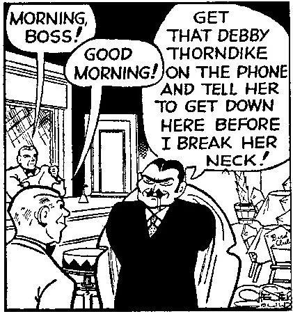 Debby was the socialite niece of Bea Thorndike, an old friend of Chief Brandon. Debby's drunkenness and fits of temper prompted Bea to ask Dick Tracy to chaperone her niece on a visit to Jacques’ establishment, the Bird Club. Jacques had another woman provoke a confrontation with Debby as an excuse to throw her out. He then followed Debby and Tracy back to the Thorndike home, where he abducted Tracy.
