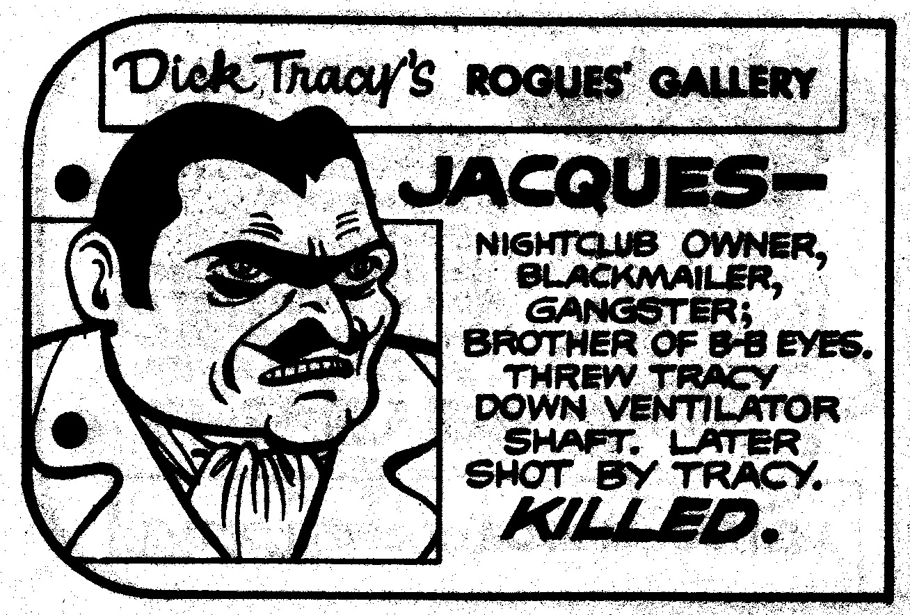 During Jacques' short time in jail, Tracy had learned that Jacques had faked the wedding ceremony, meaning that he and Debby were never actually married. Tracy joined Debby and her Aunt Bea at the Bird Club, which Debby intended to purchase and renovate. Jacques arrived and menaced Debby with a pistol, at which point Tracy shot him dead (Jan. 25, 1942).