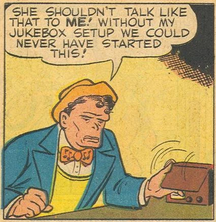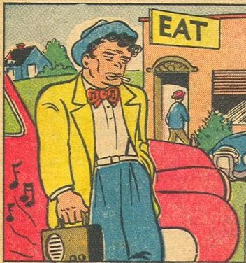 The man known as "Jukebox" Wilson was a small-time criminal in Dick Tracy'scity. He had wavy black hair and prominent lips. He typically wore a misshapen hat and a bow tie with musical notes on it. He habitually carried a portable radio in a pouch on his belt that was rigged to play automatically when the lid was opened.
