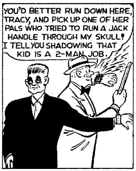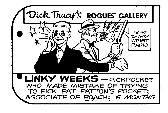 After Roach was arrested for attempting to steal Dick Tracy's wallet, Linky worked with the girl singer Themesong on the street. Themesong informed Linky that a police officer (Pat Patton) was watching them, and Linky attempted to assault Pat. Pat avoided Linky's blow and arrested him, after blacking both of Linky's eyes. However, being hand-cuffed to Linky prevented Pat from pursuing Themesong when she fled the scene of the incident.