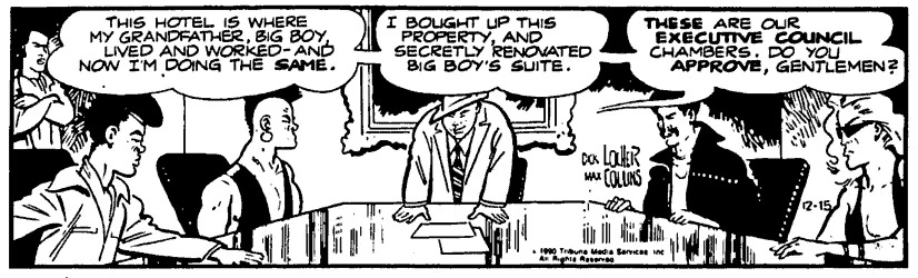 Dick Tracy was working with police gang activity specialist Sgt. Jackson to reduce gang activity and they set up several sting operations, but the gang members they arrested were represented by a high-priced attorney supplied by Little Boy. Hi-Top's activities were brought to Tracy's attention, and Hi-Top was arrested on suspicion of murder. After Hi-Top's bail was arranged, Tracy followed him back to Little Boy's hideout at the hotel.