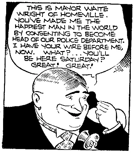 Mayor Wright had been a friend of Dick Tracy's father. Wright had aided Tracy's father financially at one point, and Tracy had promised to return the favor if he was ever able to. After Tracy distinguished himself in the plainclothes division of the city's police force, Mayor Wright contacted him to ask for help.
