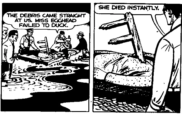 The island was soon battered by a fierce tropical storm. Chicory’s house began to flood, and Miss Egghead would likely have drowned if not for the timely arrival of Wunbrow, who freed her. The two constructed a makeshift raft out of the large wooden door to Chicory’s house. Despite surviving through many hours of rough waters and strong winds, Miss Egghead was eventually struck by some flying debris (October 25th, 1958). She died from the injury.