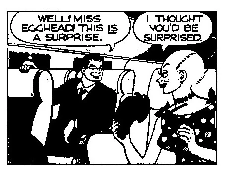 Fleeing a murder charge in the United States, Miss Egghead fled to (pre-Communist) Cuba. She obtained a short dark wig and got a suntan, hoping to disguise her features. She was tracked down by Wunbrow, who had returned to Cuba with Conchita. Miss Egghad discovered Wunbrow in her hotel room and stabbed him. She then fled.