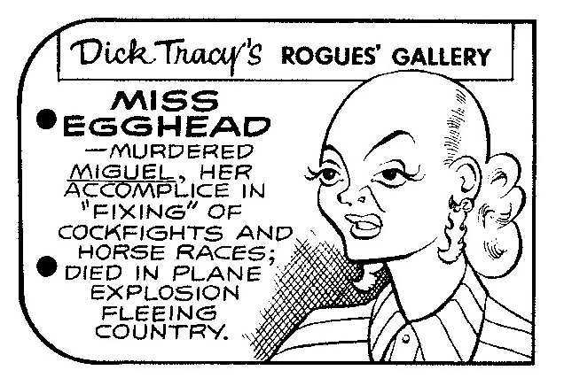 Miss Egghead was interviewed by Dick Tracy and the police, who had found a fragment of the statue lodged in Miguel's skull. Conchita, who had been taken in by Egghead, had deduced what had happened, and tried to notify the police but was stopped by Agatha. After the police left, Conchita fled with the statue, planning to reveal Miss Egghead's guilt. Miss Egghead and Agatha chased after the child, but the strain of the pursuit proved to be too much for Agatha, and she collapsed from a heart condition.