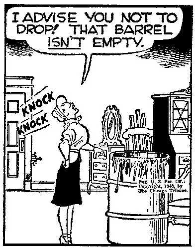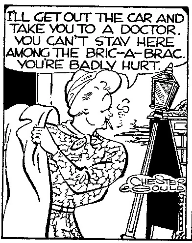 Shoulders realized that Miss Varnish had discovered his true identity and he assaulted her. He then planned to make his escape after retrieving a cache of stolen jewels and money that he had hidden in an antique pot that hung from a high rafter in the shop. Miss Varnish recovered from Shoulders' assault and removed the ladder he was standing on, leaving the man hanging from the rafter by his arms. Dick Tracy and the police soon arrived, and Shoulders was killed while making a final effort to escape.