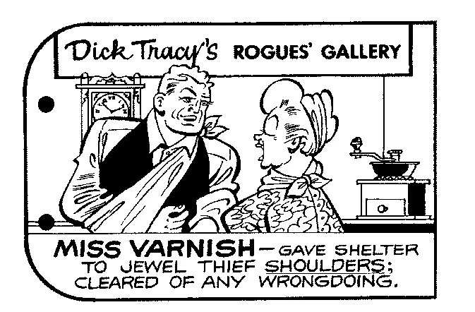 Miss Varnish (first name unrevealed) was an older woman who owned and operated an antiques store outside of Dick Tracy's city. She had light hair, full cheeks, and smoked cigarettes.