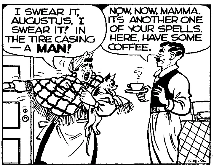 Mrs. Gus enjoyed Tonsils' singing. One day while he was painting the walls, she asked him to sing for her. He did, but his wild gesticulations caused paint to splatter from the paintbrush he was holding and onto Gus' clothes in a nearby closet. The family used gasoline as a cleanser, and Tonsils took some from the glass bottle in which it was stored to clean Gus' clothes.