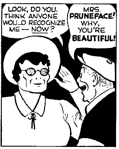 - An episode of the radio comedy The Great Gildersleeve that was originally broadcast on September 19, 1943 includes a scene in which the young character Leroy speculates with a friend about what direction the Mrs. Pruneface storyline would take. Leroy (who had been established as a fan of Dick Tracy) believed that Mrs. Prunceface would abduct the Mayor.