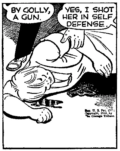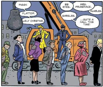 Dick Tracy and the police arrived on the scene shortly after. They had been investigating the Mayor's new cook after finding Emil's body. The Mayor's daughters had gone to the kitchen to find "Marie", and Mrs. Pruneface confronted them, wielding a pot of boiling hot soup which she threatened to throw on them. Thinking quickly, the Mayor's daughters pushed a pan of flour into a nearby fan, throwing up a makeshift smoke screen that allowed them to escape. Before Mrs. Pruneface could pursue, she was shot through the temple (September 26th, 1943).