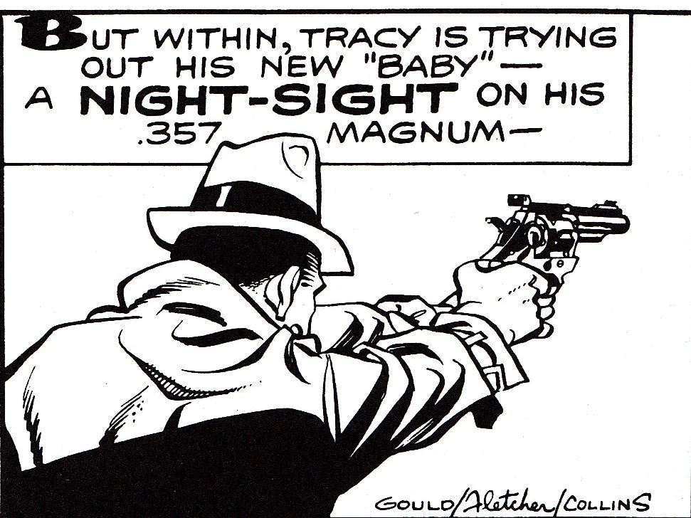 The device was first used in 1980 when Dick Tracy faced off against Art Dekko in a darkened art gallery after the criminal shut off the power. With a night-sight equipped pistol, Tracy was able to incapacitate Dekko with a single shot as Dekko tried to escape.