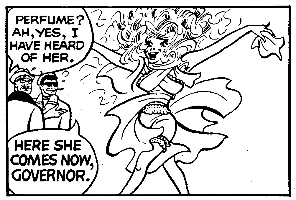 Perfume was hired as a secretary for perfume hijackers, who later tricked B.O. and Gertie into vacating their home so they could convert it into a factory to dilute and re-bottle stolen perfume. Perfume eventually thought better of the scheme and tried to leave, but the thieves hit her on the head with an empty perfume bottle and knocked her out.