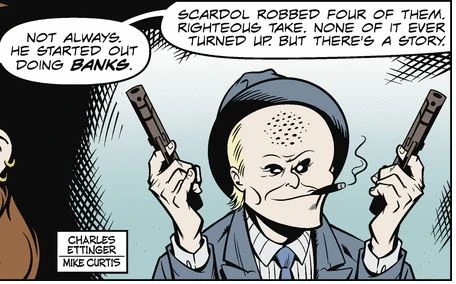 It was later revealed that Scardol's early criminal endeavor was robbing banks. He had successfully robbed four banks before deciding to switch to robbing gas stations. He reportedly never spent any of the money from his bank robberies, choosing instead to hide it. He left clues to the whereabouts of this hidden stash in the pages of a children's book, which was eventually obtained by Croptop Jones.