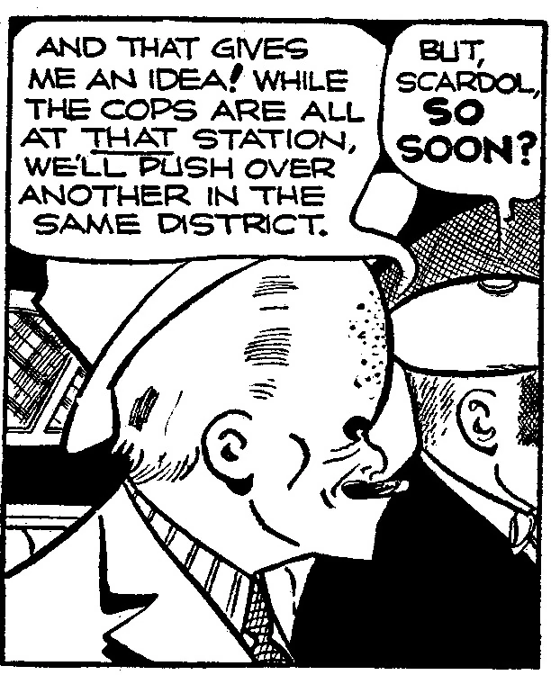After Mickey Gainer escaped the shootout between Nails Wolley and Dick Tracy, he hid with Scardol. When Scardol killed Officer Shawn who happened past one of his filling station robberies (March 18, 1939), Tracy began to investigate. Scardol laid a trap for Tracy by robbing a filling station in the rain, which caused the water-soluble paint on his car to run off and leave a trail back to his garage. Tracy, with Pop Gainer, followed it. Scardol and his accomplice Killer killed two policemen. Pop was shot and wounded, and he and Tracy were captured.