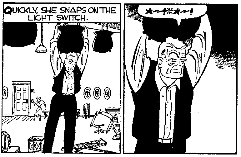 Tracy continued his manhunt and was able to track Shoulders to his new hideout. Tracy revealed to Miss Varnish the nature of her tenant's history, and she agreed to aid the police. Shoulders learned that the police were closing in on him and he prepared to flee. He attempted to retrieve his hidden stash from the pot on the high rafter, but became stranded when Miss Varnish pulled the ladder out from beneath him.