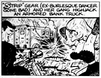 - "Strip" Gear appeared in a print ad that Chester Gould produced for Ford Autolite auto parts in 1966. She has not appeared in the actual Dick Tracy comic strip.