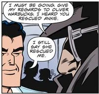 It was revealed that Tracy and Tess had met this Phantom previously. The Phantom also expressed a familiarity with Oliver and Annie Warbucks. Tracy introduced the Phantom to Junior and Honeymoon before the Phantom continued on his way.
